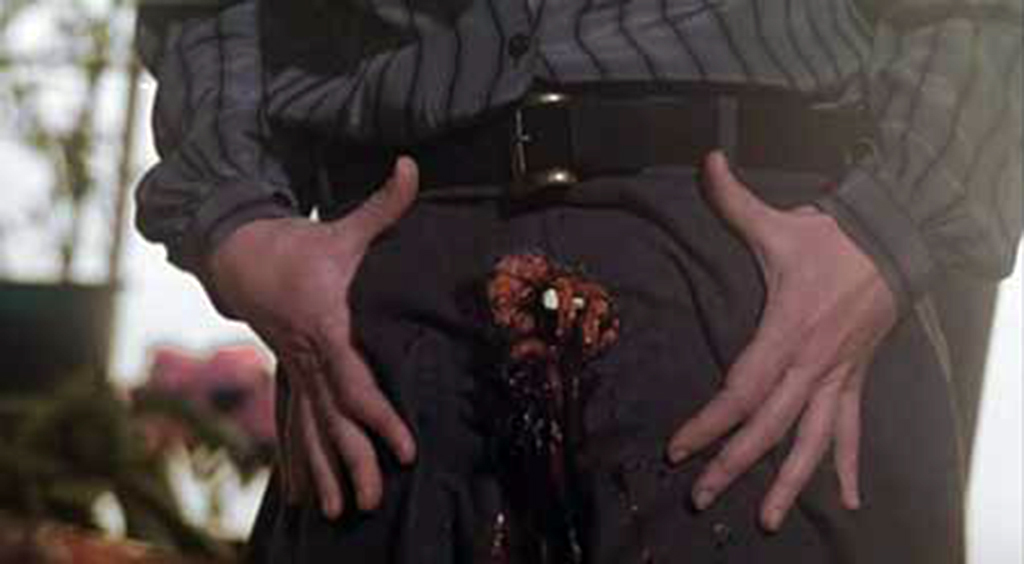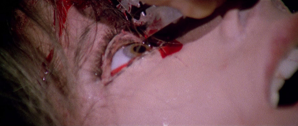 By now, you’ve probably got the gist that these fossils are definitely not to be trifled with, but Fulci isn’t done. The very next scene shows the housekeeper, Maria (Carla Cassola) approaching the greenhouse. She passes one-eyed groundskeeper Peter (Al Cliver), who appears to be digging a grave in the garden. She then goes into the greenhouse and finds Sarah fussing over her flowers. She informs Sarah that she will have to be leaving the couple’s employ to care for her mother. Sarah takes this all in stride, making sympathetic and understanding noises right before swiftly turning, grabbing some kind of spear-like garden implement, and stabbing Maria right in the delta of Venus.