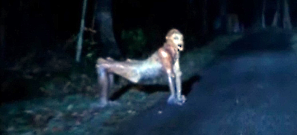 Meanwhile, a light shines out in the woods again. Two people driving down a dark country road hit a freaky-looking creature with their car (in one of the movie’s creepier scenes, and in fact one that made the rounds on YouTube labeled as a “real” monster sighting), and stupidly go into the woods to try to find it. The creature kills the man, goes back to the car and takes care of the woman, then circles around to a house. It attacks the woman living within and impregnates her. Her belly swells to gargantuan proportions in minutes, and then a fully-grown, blood-slick Sam comes crawling out of her monumentally wrecked vagina. After heading back into the woods and stealing the clothes off the car-driving dude he killed, Sam heads to London to try and track down his family.