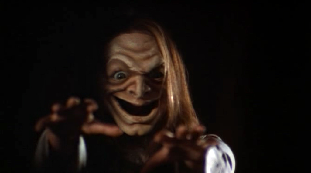 Of course, you can see where this is going. One by one, the youngsters wander off alone for one reason or another and get either straight-up murdered or taken captive by a heavyset dude in a wig and an eerie-looking mannequin mask. It’s here that the movie is really at its most effective, because the killer, as well as the shadowed shots of the mannequins, are intensely skin-crawling. It’s also worth noting that the killer, for absolutely no reason whatsoever, has telekinetic powers, and can sic mannequins on people and make their mouths drop open in a really, REALLY unsettling way.