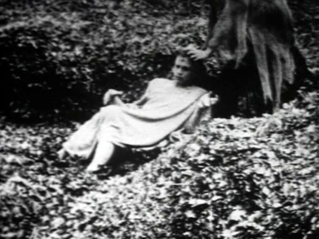 The first thing I gotta say is that this certainly does look like a legitimate silent film from the era. It’s filmed in very stark black and white, and the film stock is all grotty and the camera work shaky, so kudos for realism. There is also no sound other than the constant drone of crickets, and the occasional grunt. The first shot is a shack in the woods, and already I’m digging the whole look of the thing; it really conveys that creepy, otherworldly feel I look for in my old silent films. I have a creeping suspicion that the entire production is going to be intensely arty-farty, but I don’t have a huge problem with either arts or farts, so it’s all good.