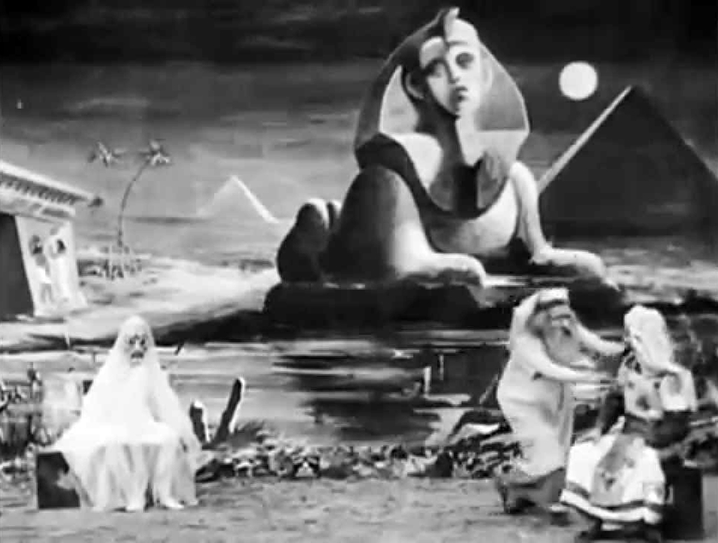 We open on a shot of exotic Egypt, or at least a painted backdrop thereof. You know, sand, pyramids, temples, the whole deal. In the foreground is the Sphinx, bearing a hilariously eye-rolling facial expression like he just can’t deal with this shit anymore. A man and woman enter stage right. They’re both wearing long robes, and the guy looks like a sheik and has a huge fuck-off beard. He’s gesturing to the woman as if to say AND ALL THIS COULD BE YOURS IF THE PRICE IS RIGHT, and then he bows to her and she sits on a convenient stack of boxes nearby while he waves his arms grandly, all JUST SIT RIGHT THERE LITTLE LADY, I’M ABOUT TO BLOW YOUR MIND.