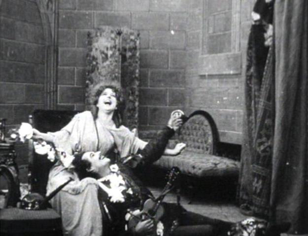 And then king stares daggers at the troubadour, so I guess princess didn’t talk him out of shit, and then he’s gesturing around to everyone again, seeming to tell them all to come back with him to wherever they went off to before (maybe the bear baiting was starting in the courtyard?), but then a guy runs in and bows before the king and tells him something that seems pretty urgent (the bear escaped and started eating the gathered peasants?), and everyone’s raising their arms in panic and running out of the room. The king tries to drag princess out with him, but she’s all NOPE, GOTTA PEE, I’LL MEET YOU THERE and he’s all YEAH, YEAH, OKAY, I’M GOING, SOMETHING SOMETHING CUCKOLD and princess is all FUCK YEAH, GO OUT THERE AND CATCH THAT BEAR, MY HUNK OF KINGLY MAN-MEAT, I TOTALLY SWEAR I’M NOT GONNA BE RIDING THIS MOUSTACHE THE SECOND YOU LEAVE and as soon as the room is empty, she’s all over the troubadour like white on rice, you guys, flinging her clothes asunder, tearing his pantaloons savagely off him in her eagerness to get her mouth on that pulsing, glistening…oh wait, sorry, none of that happens, she just hugs him and drapes a garland of flowers around his neck. They didn’t know how to sex yet in 1909.