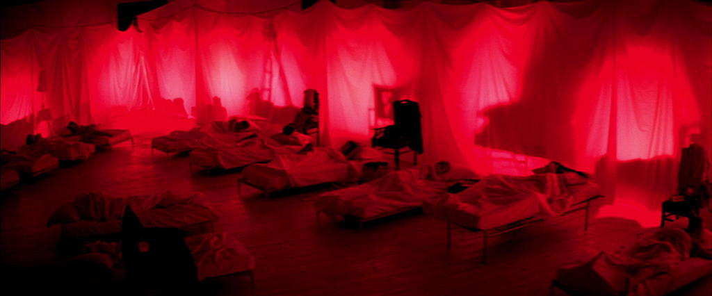 While the students’ rooms are being de-grubbed, the staff set up an impromptu dorm in the practice hall, with rows and rows of fold-out beds, and the girls and boys separated by high white curtains. All the women are getting into their beds and trying to make the best of things, saying it’ll be just like camp. One of the heads of the academy, the sternly efficient Madame Blanc (Joan Bennett), walks through the dorm to make sure everyone is comfortable. One of the students asks if the teachers will all be sleeping in the dorm too, to which Madame Blanc replies that all of them certainly will be, except for the directress, of course. Then Madame asks if it’s all right if she turns the lights out. She disappears behind one of the curtained walls, and immediately the whole space is plunged into a saturated, blood-red dimness, like a photographic darkroom.