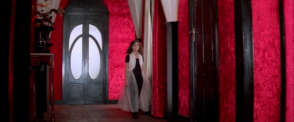 There is some banter and chicanery, as one of the male students climbs up to say hello from the other side of the curtain, and then the students settle into bed and begin gossiping and arguing until one of the girls tells them to put a sock in it so they can all get some sleep. Then there’s a creepy panning shot across the dark red dorm, and on the soundtrack are the eerie sounds of sighs and wails and screams, threaded through an ominous prog-rock beat (provided by frequent Argento collaborators Goblin). We can see shadowed silhouettes of presumed staff members sleeping on the other side of the curtain, filtered through that intense red light. Then we close in on a silhouette of one empty bed. A weird shadow approaches the bed and sits down on it. It appears to be a woman, but something about her is…off. She almost looks bald, for one thing, and as she lies back on the bed, the silhouette of her body through her nightgown looks like a skeleton, almost like an x-ray. The background music gets louder and weirder (and I have to say that I absolutely love Goblin’s score for this film, which actually doesn’t seem as though it would work, but does, beautifully). We see Suzy and Sarah lying in their beds side by side, and behind them is that creepy-ass silhouette on the other side of the curtain. Then we start to hear this weird, rattling wheeze.